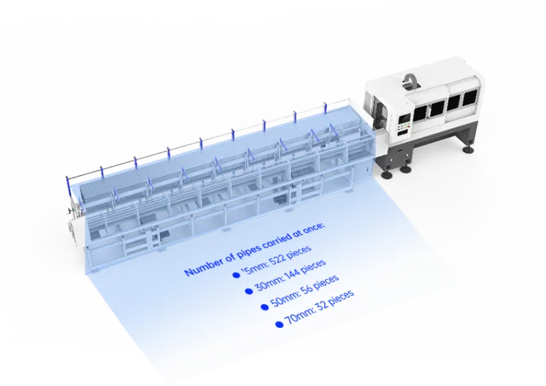 A LX-FL120V1/150V1 foi projetada para quem busca produtividade e precisão no corte de tubos redondos. Com carregamento totalmente automático, basta posicionar até 6 m de matéria-prima no rack de armazenamento para que a máquina opere de forma contínua, 24 h por dia.