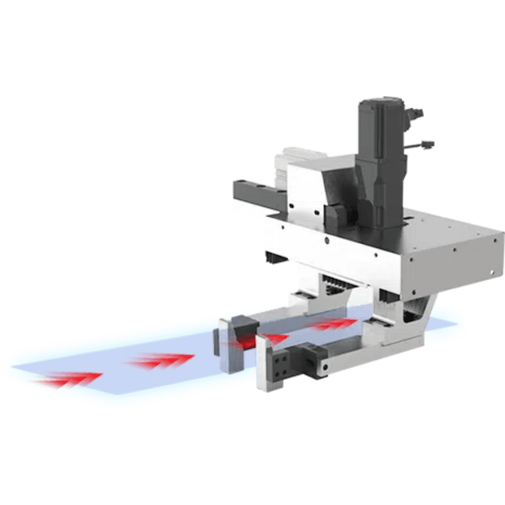 Sistema de acionamento por cremalheira e pinhão de alta precisão, com reconhecimento automático dos lados longos e curtos dos perfis, garantindo alimentação estável, resposta rápida e baixa taxa de falhas.
