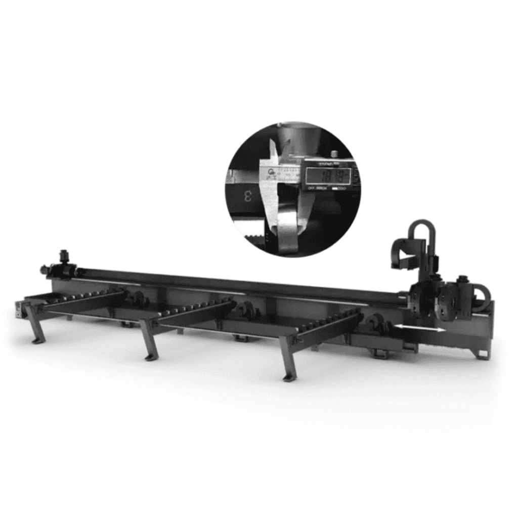 O design exclusivo do mandril frontal móvel permite que o cabeçote de corte opere entre os dois mandris, atingindo resíduos mínimos de aproximadamente 40 mm, aumentando significativamente o aproveitamento do tubo.